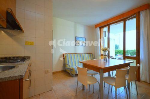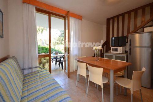 C - 4 főre: nappali, konyhasarok, hálószoba franciaággyal, hálófülke emeletes ággyal, fürdőszoba, tv, széf, mikró, légkondicionálás, erkély. Az 1. emeleten van.