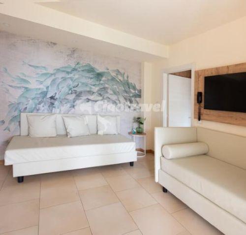 Family XL - 6 főre: nappali 2 kanapéval, konyhasarok, hálószoba franciaággyal, hálószoba 2 ággyal, fürdőszoba, tv, széf, kicsi hűtő, légkondicionálás, hajszárító, erkély/ terasz. Felújított szobák a földszinten, 1. vagy 2. emeleten van. (38 m2)